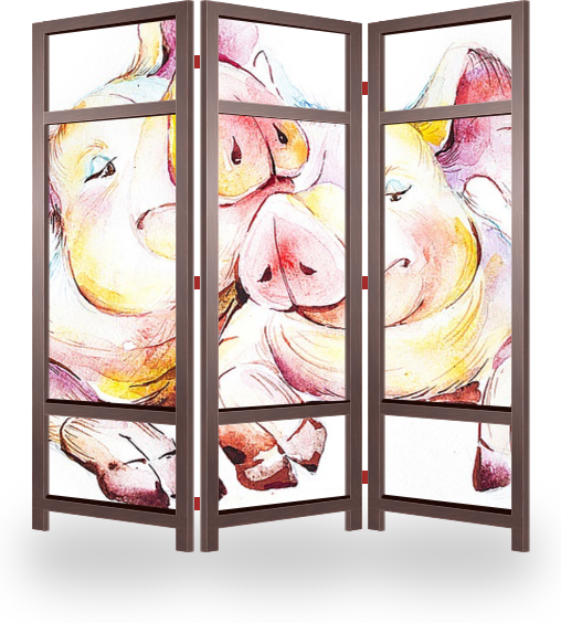 Описание ширмы "Счастливые поросята" картина акварелью, автор Богданова Ольга, оригинал 30х21, декабрь 2018.
