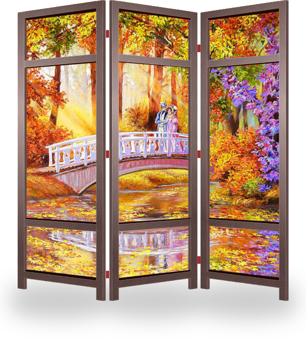 Описание ширмы Изысканная светская пара 19века на прогулке по осеннему парку. Навстречу солнечному свету, льющемуся сквозь ветви деревьев, по ажурному белому мосту, словно в сказочно чудесном только их красочном мире, идут навстречу своей благосклонной судьбе...а п