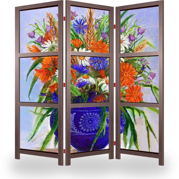 Описание ширмы Букет из разных цветов в сиге-фиолетовой стеклянной вазе (натюрморт, натюрморты, цветок, цветы, календула, ноготки, ромашки, ромашка, василёк, васильки, колокольчики, полевые цветы, ваза, стекло)