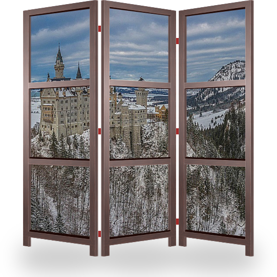 Описание ширмы Вечер в Альпах, всемирно известное место, замок Нойшванштайн возвышается на скале, зима, деревья покрыты снегом, темное, мрачное небо навевает дух старины и сказки