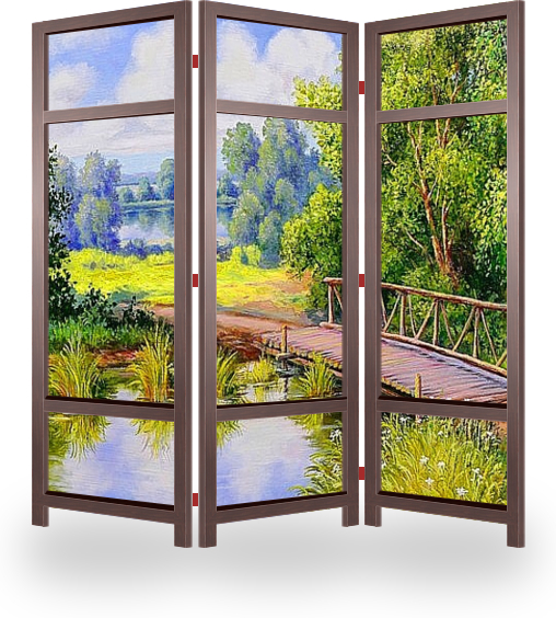 Описание ширмы Летний пейзаж средней полосы России. Живописная картина с изображением белоствольных березок на берегу небольшой речушки, через которую переброшен деревянный мосток. Мосты и мостики...они как соединители двух судеб, двух сердец...двух времен если хот