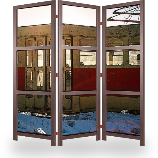 Описание ширмы Раним утром, прогуливаясь по родному городу сделал несколько кадров вагона трамвая. И в то самое время он проезжал по зимней дороге сквозь лучи солнца.