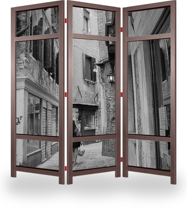 Описание ширмы Городской пейзаж в чёрно-белом исполнении может украсить любое помещение вашего дома, квартиры, отеля, офиса, турфирмы.