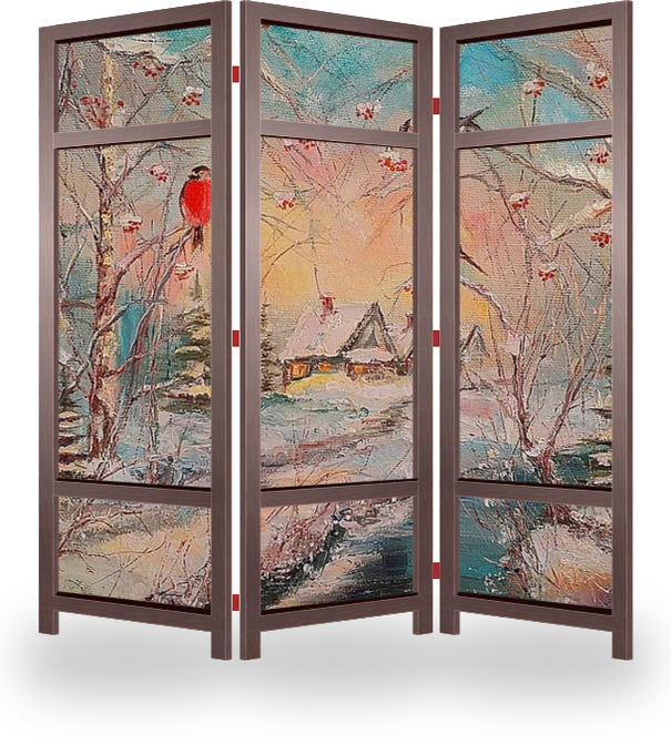 Описание ширмы Моя авторская работа,холст масло . Оригинал в одном экземпляре . Картина навеяна волшебной красотой зимней природы , волнующим сочетанием бирюзовых и алых цветов неба и птиц .
