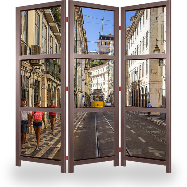 Описание ширмы Колорит Лиссабона. Узкие улочки по которым туда-сюда солнечным днем снуют трамваи и неспешно прогуливаются туристы.