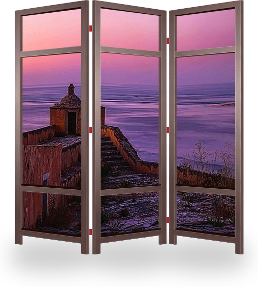 Описание ширмы Башня старинного замка - поусады в Португалии. Красиво смотрятся древние стены в лучах розово-сиреневого фантастического заката.