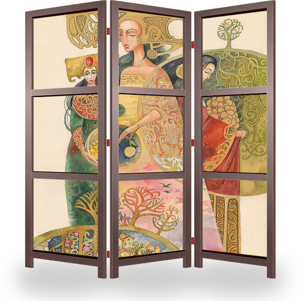 Описание ширмы Картина в силе символизм, выполнена в авторской манере с большим количеством интересных деталей. Хорошо смотрится в интерьере самостоятельно и в качестве декора предметов интерьера