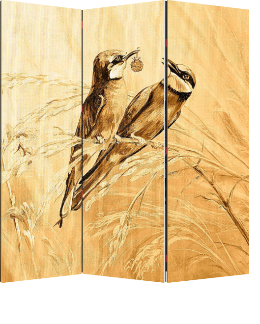 Описание ширмы Две маленькие птички золотистые щурки на тоненькой веточке, в окружении воздушных тончайших трав, как благопожелание на обретение второй половинки, как талисман верности и любви, ведь человечество с незапамятных времен считало птиц воплощением вдохно