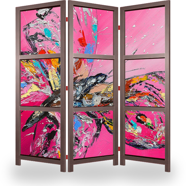 Описание ширмы Любовь Купцова - художник, работающий с различными материалами и техниками. Прежде всего это масло и акварель. Также занимается вышивкой, прижиганием по ткани, росписью стен.Самыми любимыми сюжетами являются животные, птицы, цветы и люди. Особое мес