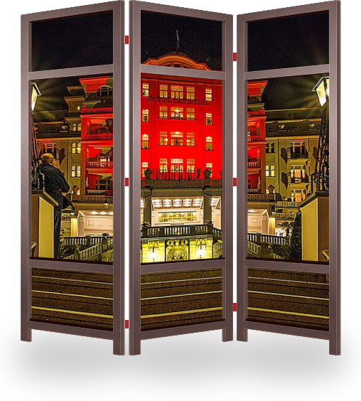 Описание ширмы Интересно и необычно смотрится историческое здание отеля "Империал" в Карловых Варах в праздничном освещении.