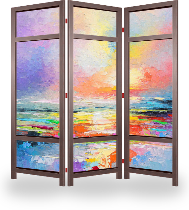 Описание ширмы Любовь Купцова - художник, работающий с различными материалами и техниками. Прежде всего это масло и акварель. Также занимается вышивкой, прижиганием по ткани, росписью стен.Самыми любимыми сюжетами являются животные, птицы, цветы и люди. Особое мест