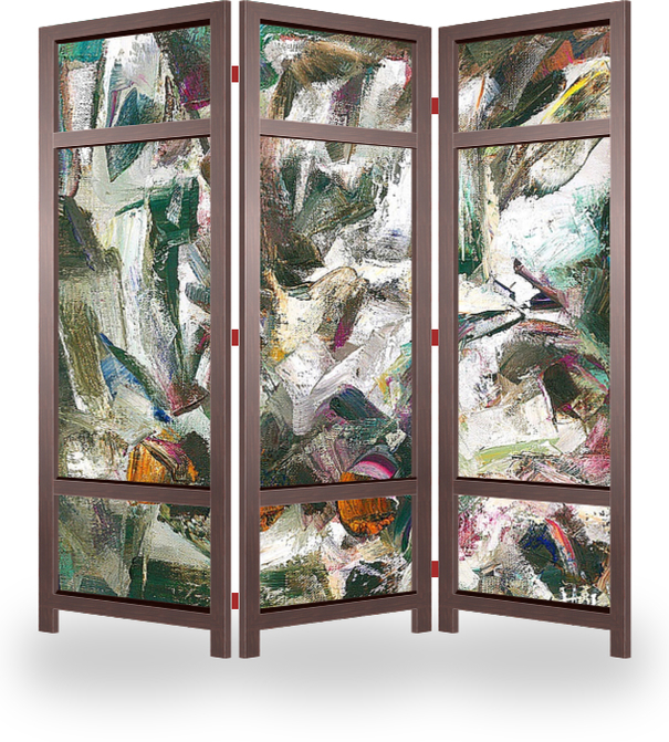 Описание ширмы картнина, выполненная в абстрактной манере, россказывает о грецких орехах, лежащих на динамических тканях. Прекрасное полотно для украшения стен экспрессивной живописью.