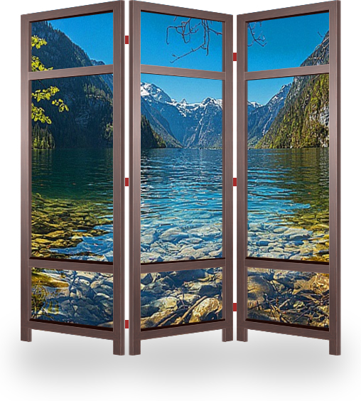 Описание ширмы Солнечный день в Баварии, озеро K?nigsee, Германские Альпы, не переднем плане камни в воде, на заднем плане горы, время года весна, хорошие настроение