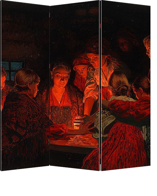 Описание ширмы Тема погони за удачей воплощена и в полотне "Святочное гадание" и в картине "Гадание. Ночь на Ивана Купалу". Сакральное значение последнего рождается из смешанных представлений о языческих и христианских обрядах. Люди издавна находили утешение у воро