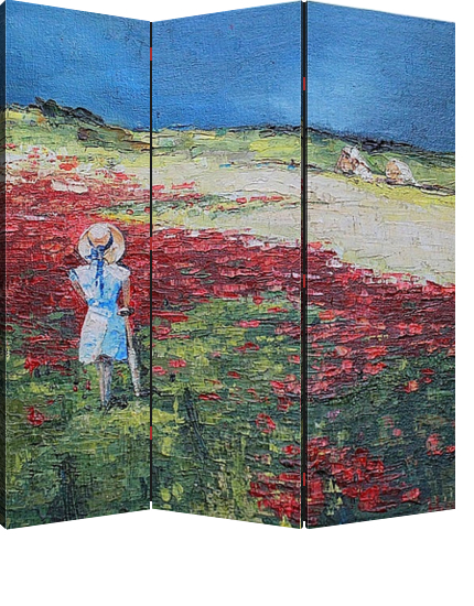 Описание ширмы "Маковое поле", размер картины 30х40 см (холст, масло). Данная картина получилось очень яркой за счет темного неба и ярких, насыщенных алых цветов.