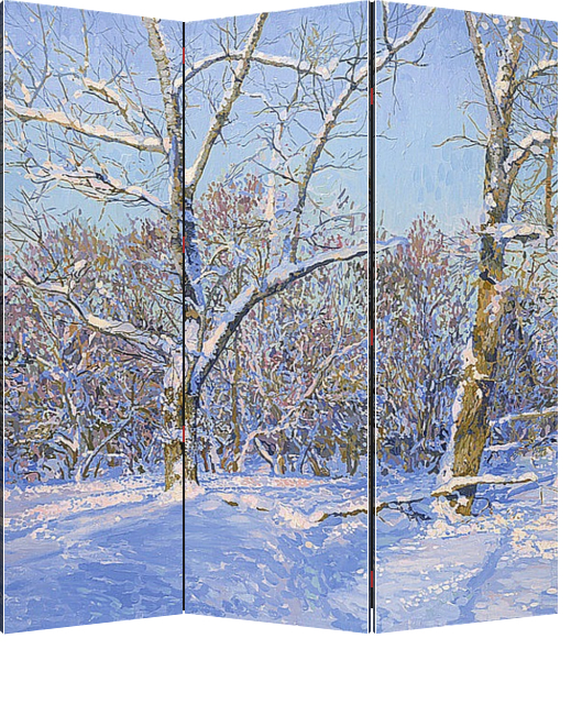Описание ширмы Написанный в Опалихе, недалеко от Красногорска пейзаж задумывался автором как серия пейзажей с временами года. Солнечный день, и мороз на снегу нежные рефлексы от неба и деревьев создают приятную цветовую гамму, погружая зрителя в среду.