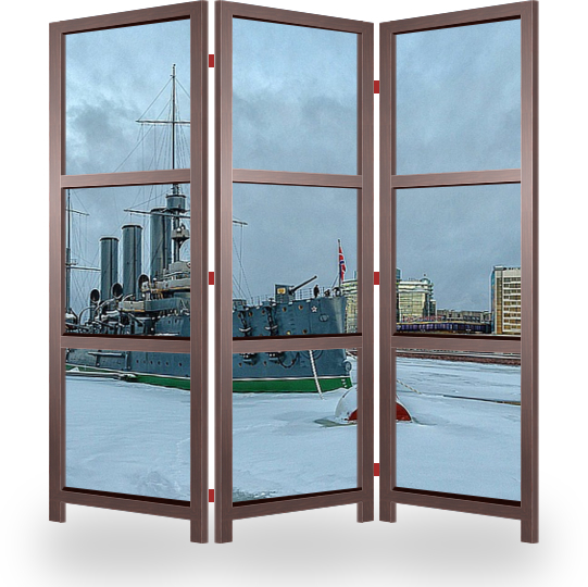 Описание ширмы Зимнее утро на Петроградской набережной. Через полчаса солнце пробьется через горизонт домов и осветит город чудесным, меняющим свою тональность, светом. А пока - сумрак и тишина...