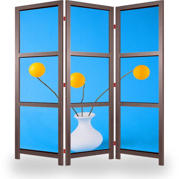 Описание ширмы Минималистский этюд с красной вазой и оранжевыми шариками. Формы и яркие цвета переплетаются, создавая настроение и визуальные образы.