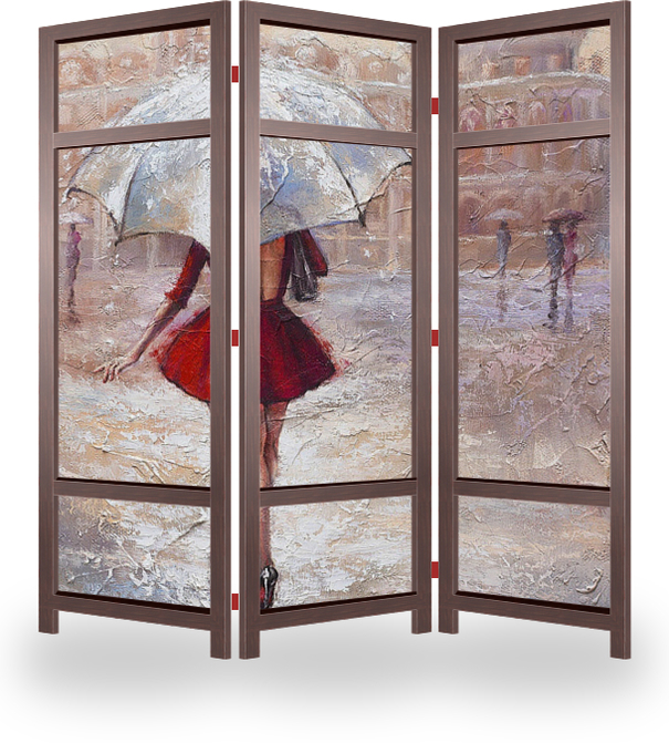 Описание ширмы Написал на текстурном холсте масляными красками романтическую картину. Девушка в красном платьишке идёт по дождливому Екатеринбургу с белым зонтом.