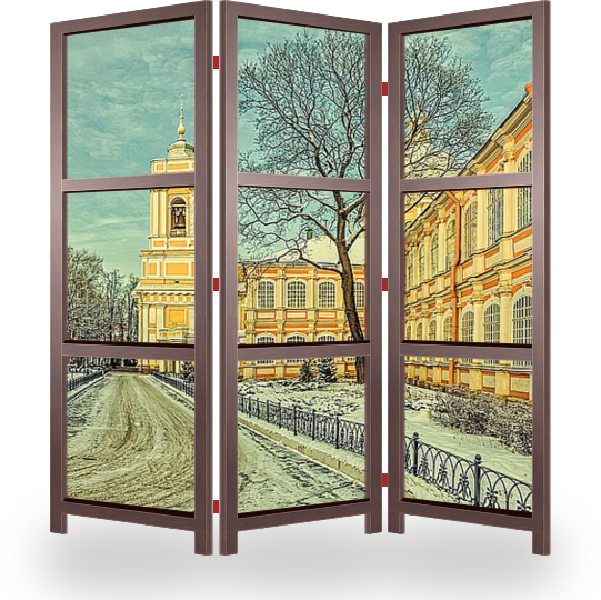 Ширма эконом отлично подойдет для временного размещения, рекламы, для отгораживания объектов интерьера и его дополнения. Лицевая сторона с изображением, обратная сторона открытый каркас