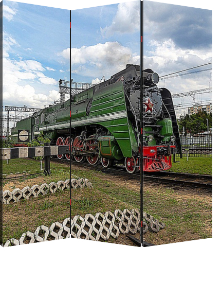 Описание ширмы Паровоз П36 (тип 2-4-2) получил прозвище Генерал за характерные цветные полосы («лампасы») по бокам. По мощности он был эквивалентен паровозу серии ИС, но имел нагрузку от осей на рельсы не более 18 тс, благодаря чему мог эксплуатироваться на подавля