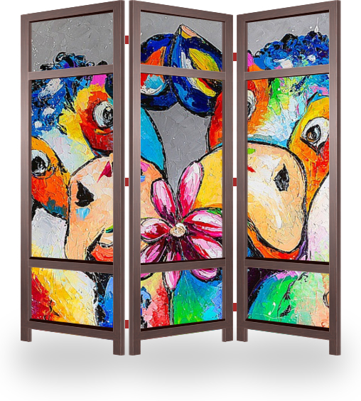 Описание ширмы Любовь Купцова - художник, работающий с различными материалами и техниками. Прежде всего это масло и акварель. Также занимается вышивкой, прижиганием по ткани, росписью стен.Самыми любимыми сюжетами являются животные, птицы, цветы и люди. Особое мест