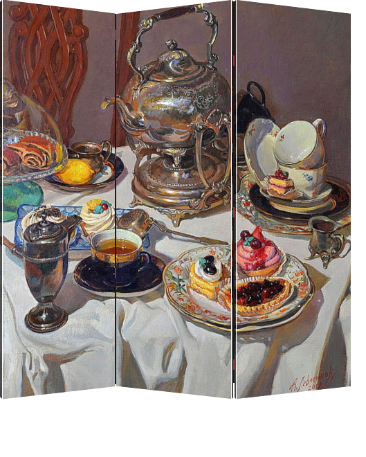 Описание ширмы С чем ассоциируется у людей изображение аппетитных пирожных и ароматного чая в чашке? С уютом, приятной беседой, со сладкой жизнью! Этот натюрморт станет отличным подарком для дорогого человека, украсит кухню, наполнит уютом любой интерьер. Ведь он и