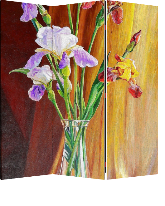 Описание ширмы Живописная картина, натюрморт "Солнечный" автор Елена Самарская. Букет обычных садовых ирисов в стеклянной вазе, расположен на окне задрапированном мягкими складами гардинного полотна и массивных штор, сквозь которые на букет льется солнечный свет.Ле