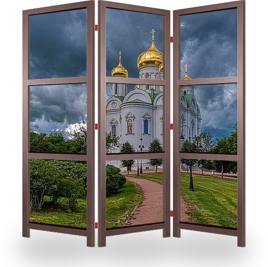 Описание ширмы Санкт-Петербург, город Пушкин, Царское село, Екатерининский собор, летний городской пейзаж, грозовое небо.