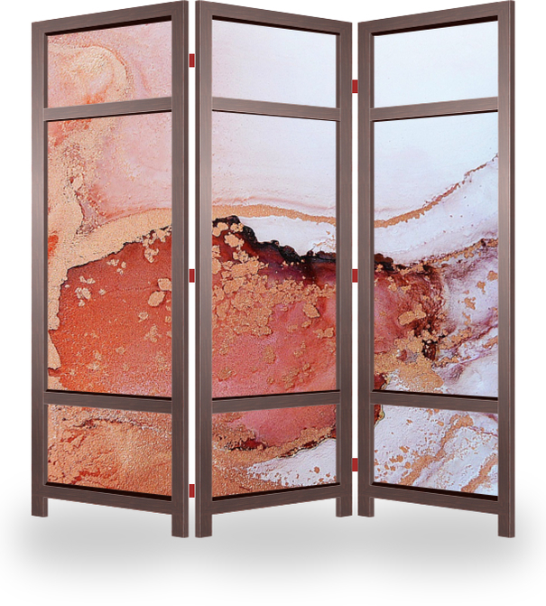 Описание ширмы Картина выполнена алкогольными чернилами, что задает своеобразную динамику композиции..."Бронзовый танец" - современное сочетание цветов придаст вашему интерьеру роскошь и благородство, в то же время уют и гармонию...