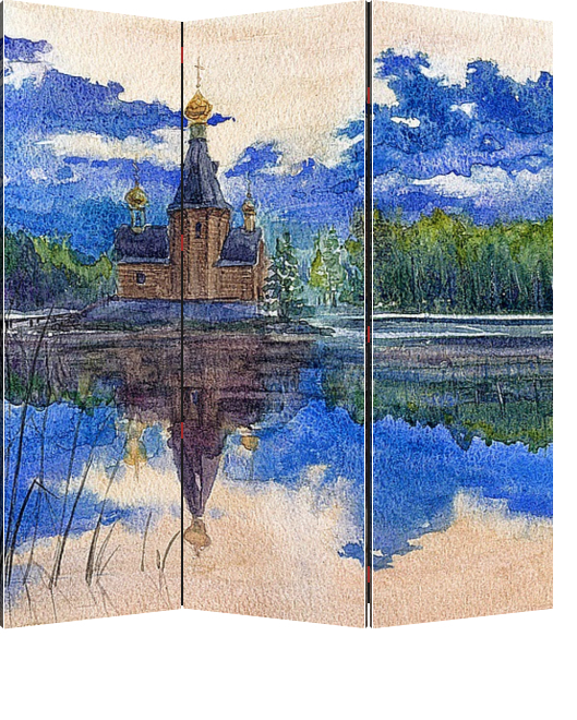 Описание ширмы Одинокая церковь на берегу озера в лесу. Яркие краски лета и бегущие по небу густые облака дают сильное желание творить!