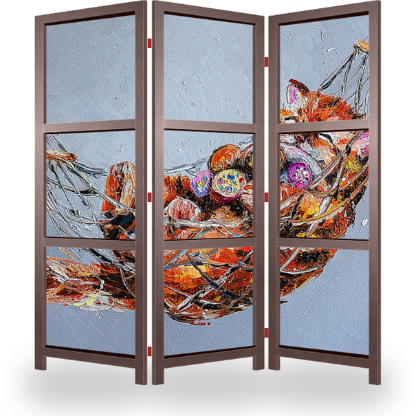 Описание ширмы Любовь Купцова - художник, работающий с различными материалами и техниками. Прежде всего это масло и акварель. Также занимается вышивкой, прижиганием по ткани, росписью стен.Самыми любимыми сюжетами являются животные, птицы, цветы и люди. Особое мест