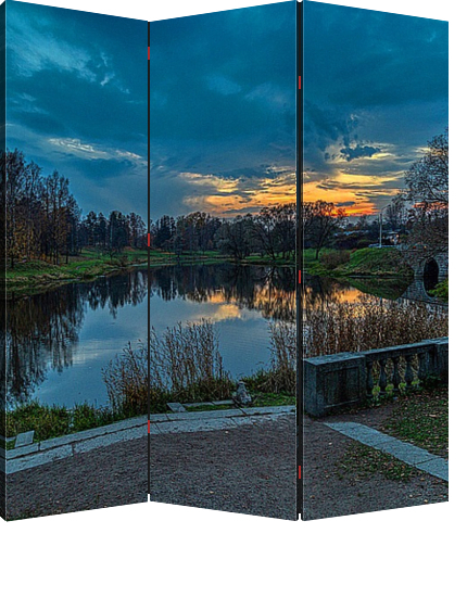 Описание ширмы Санкт-Петербург, Павловск, осенний пейзаж, вечер, закат, отражение в пруду.