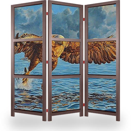 Описание ширмы На картине изображена сасмая крупная хищная птица Европы, белохвостый орлан в момент охоты. 34х79. Кожа, масло. 2015 год.
