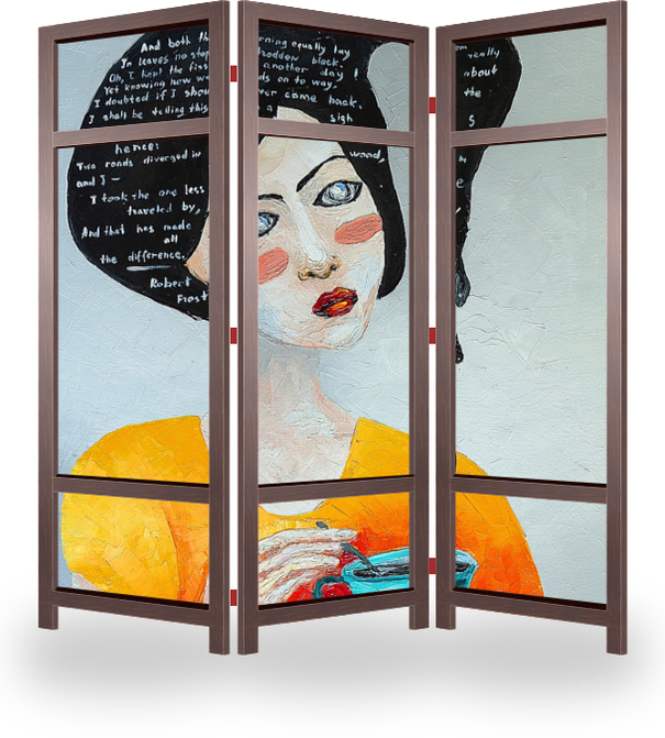 Описание ширмы Любовь Купцова - художник, работающий с различными материалами и техниками. Прежде всего это масло и акварель. Также занимается вышивкой, прижиганием по ткани, росписью стен.Самыми любимыми сюжетами являются животные, птицы, цветы и люди. Особое мест
