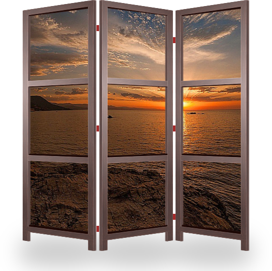 Описание ширмы Морской пейзаж на фоне рассвета. На заднем плане горы и облака. Фотография сделана в путешествии в Крым.