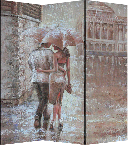 Описание ширмы Написал на холсте романтическую картину масляными красками. Начало любви молодой пары. Влюблённые гуляют под зонтом по дождливому Екатеринбургу.