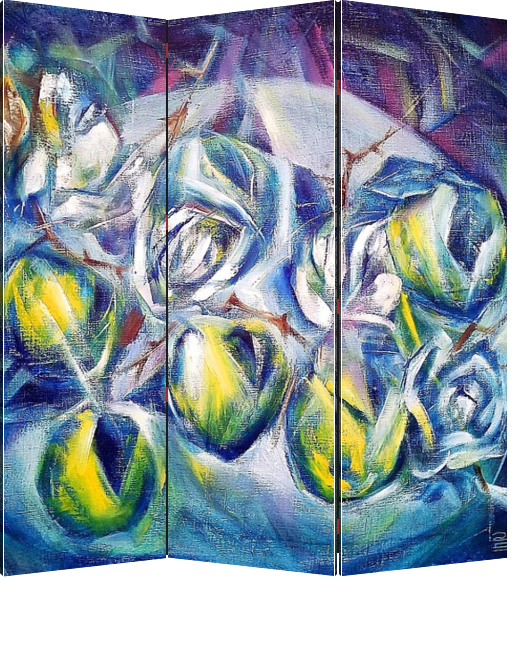 Описание ширмы Работа выполнена маслом на холсте, будет интересна поклонникам современной живописи. Прекрасно дополнит любой интерьер от офиса до жилого помещения. Станет отличным подарком любителям картин написанных в стиле авангард, поп-арт.