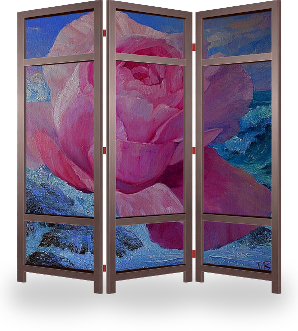 Описание ширмы Цветок дикой розы сорвался со своего колючего стебля приковывающему ее к земле и грубым скалам морского берега и в восхитительном свободном полете над бушующем морем стремится к неизведанному но прекрасному рассветному горизонту своей мечты