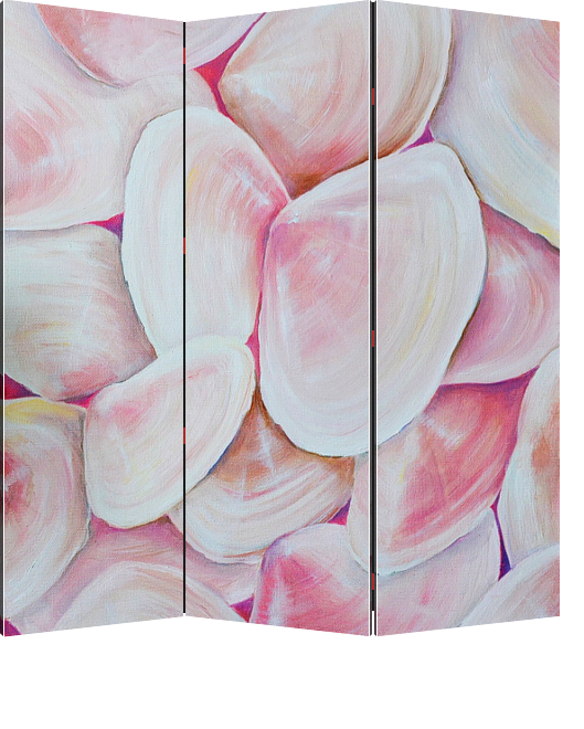 Описание ширмы Перламутровые ракушки на розовом фоне, напоминающие лепестки цветка. Современная картина прекрасно впишется в комнату со нежным, спокойным интерьером