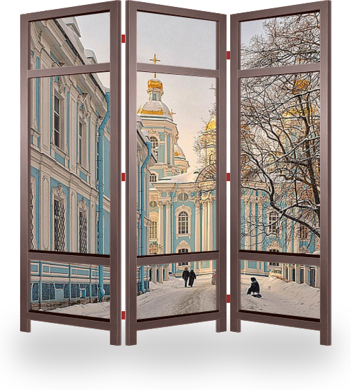 Ширма эконом отлично подойдет для временного размещения, рекламы, для отгораживания объектов интерьера и его дополнения. Лицевая сторона с изображением, обратная сторона открытый каркас
