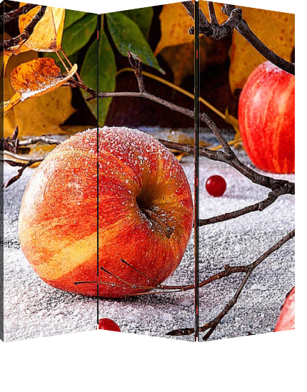 Описание ширмы Ветер угнал пургу, Солнечный луч –каприз. Яблоки на снегу, Сказка, набросок, эскиз. Как, почему, зачем? Вторит вопросу вопрос. Вот вам одна из тем: Кто их сюда занёс. Пурга погостила в саду, Устроила свой карнавал. Яблоки на снегу. Такого никто не жд