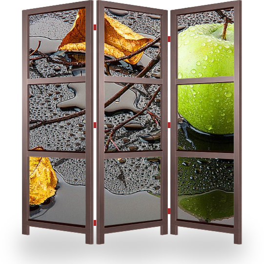 Описание ширмы Зелёное яблоко на чёрном зеркале в каплях воды. Постер на тему осенней food фотографии.