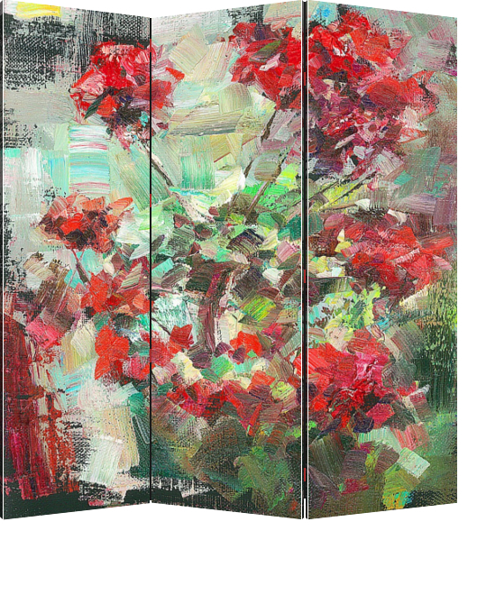 Описание ширмы быстрый этюд с геранью , постер с которого послужит прекрасным украшением вашего интерьера, придаст ему деревенской теплоты.