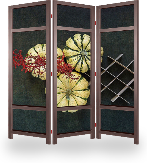 Описание ширмы Натюрморт с декоративными тыквами. Продукты питания являются прекрасным объектом для фотосъёмки в различных условиях и всегда прекрасно смотрятся на любом фоне и с любого ракурса.