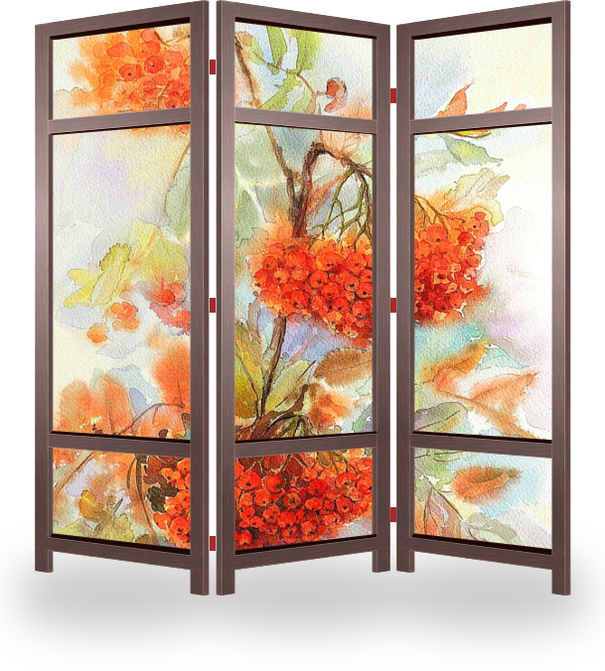 Описание ширмы Акварель "Рябина" прекрасная картина с осенним настроением. Солнечная,теплая, яркая как золотая осень.