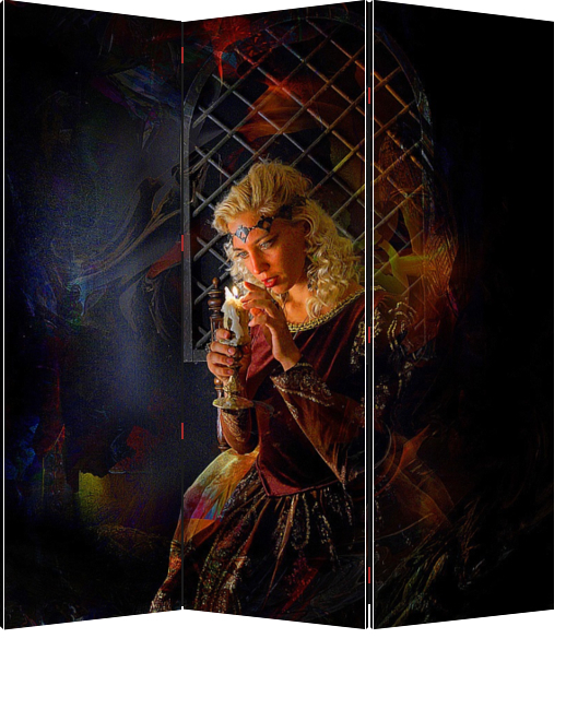 Описание ширмы портрет девушки в старинном платье в таинственном полумраке вызывает множество ассоциаций,огонек свечи и задумчиво- сосредоточенное лицо девушки на черном фоне создают эмоциональное напряжение сюжета.
