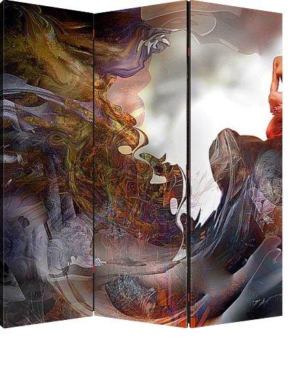 Описание ширмы Атмосферная картина вне пространства и времени, Изящная фигура прекрасной девушки на фоне ирреалистичного, динамически закрученного пейзажа побуждает пассивное зрительское созерцание трансформироваться в .эмоциональное эстетическое восприятие