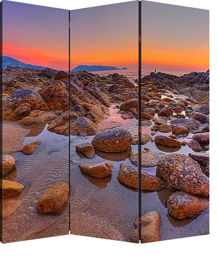 Описание ширмы Впечатляющий закатный пейзаж морского побережья на отливе, на котором раскинулись различные скопления камней и валунов. Яркие краски неба и земли! Пхукет, Тайланд.