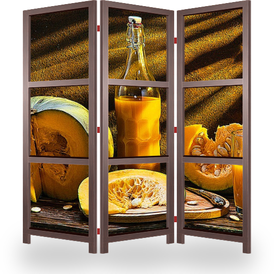 Описание ширмы Натюрморт с тыквой и свежеприготовленным тыквенным напитком в стеклянной бутылке, освещённый жёлтым светом, с эффектной подсветкой фона.